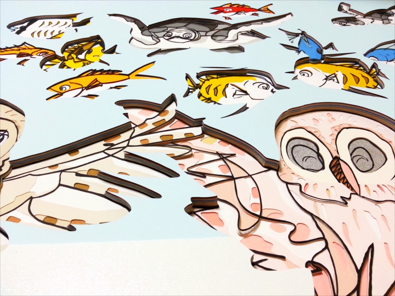 紙を幾重にも重ねてアートナイフで“彫り”、独特の配色による色彩の美しい立体的な作品を作ります。豊富な色数と様々な紙の質感を組み合わせることで生まれる、切り絵とは違った“奥行き”が彫紙アートの魅力です。