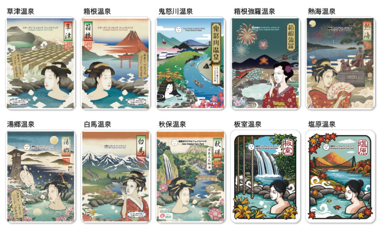 その中でも「ご当地フェイスパック」は、日本的で各地域限定のオリジナルパッケージデザインが目を引き、お土産品として各地域のPRにも役立っております。
