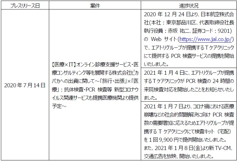 プレスリリース案件の進捗状況に関するご報告