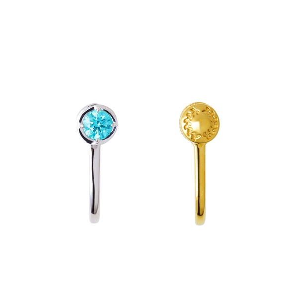 片方は側面に刀の柄模様を取り込み、イメージカラーストーンをセットした一粒タイプ。もう一方は鬼殺隊の隊服ボタンを取り込んだデザインです。