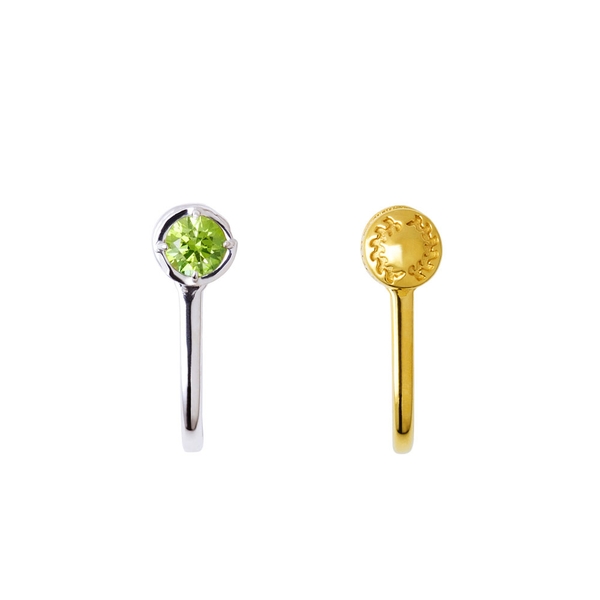 片方は側面に蛇の鱗を取り込み、イメージカラーストーンをセットした一粒タイプ。もう一方は鬼殺隊の隊服ボタンを取り込んだデザインです。