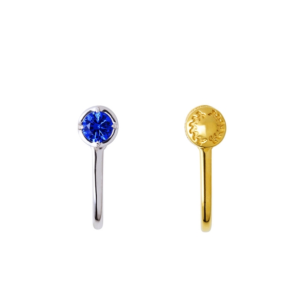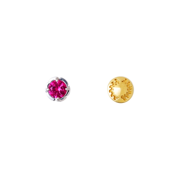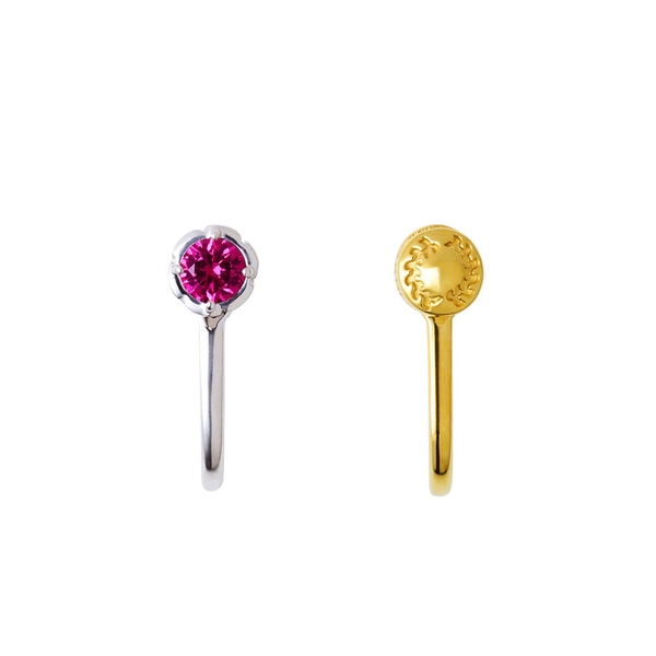 片方は側面に目の周りの模様を取り込み、イメージカラーストーンをセットした一粒タイプ。もう一方は鬼殺隊の隊服ボタンを取り込んだデザインです。
