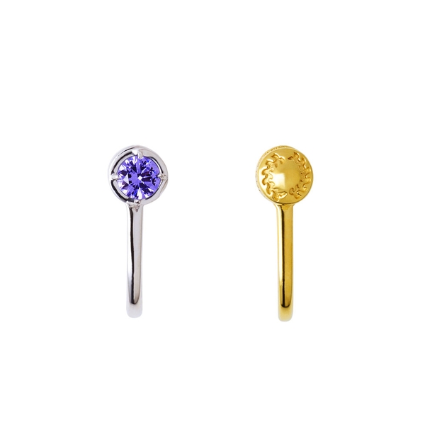 片方は側面に着物の模様を取り込み、イメージカラーストーンをセットした一粒タイプ。もう一方は着物の模様を象ったデザインです。