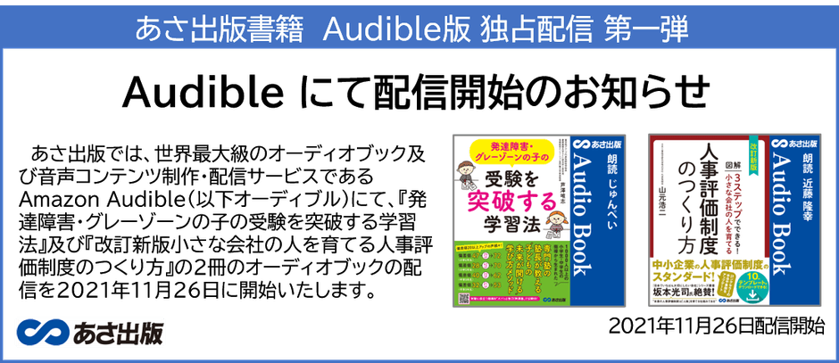 株式会社あさ出版(代表取締役:佐藤和夫、所在地:東京都豊島区)は、世界最大級のオーディオブック及び音声コンテンツ制作・配信サービスであるAmazon Audible(以下オーディブル)にて、『発達障害・グレーゾーンの子の受験を突破する学習法』と『改訂新版小さな会社の人を育てる人事評価制度のつくり方』の2冊のオーディオブックの配信を2021年11月26日に開始いたします。