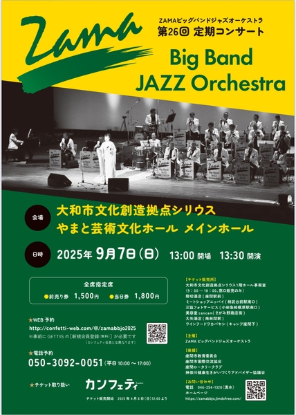 ZAMAビッグバンドジャズオーケストラ『第26回定期コンサート』が2025年9月7日 (日)に大和市文化創造拠点シリウス 1階芸術文化ホール メインホール(神奈川県大和市大和南1丁目8-1 シリウス1階)にて開催されます。