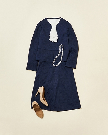 華やかなジャカード柄のジャケット&スカートはきちんと感があり、特別なシーンでの装いにぴったり。