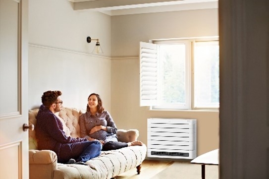 地域の暖房文化に溶け込み、環境にも配慮した床置形エアコンです。一年の半分以上で暖房を利用する豪州南部やニュージーランドでは、体を芯から暖める暖炉や温水ラジエーターなどが主流ですが、環境意識の高まりからヒートポンプ暖房への置き換えが進んでいます。本製品は、ダイキン独自の2方向吹き構造により、現地のお客様が好む暖炉のような温もりを届ける機能や、足元だけを暖めたいときに床面から素早く暖める機能を搭載しています。前面パネルのスリット加工は、温水ラジエーターのような現地の暮らしに馴染みがあるデザインを取り入れています。また、室内機は、居室空間に圧迫感を与えない壁埋め設置が可能です。将来的には、本製品を日本や北米へも展開する予定です。