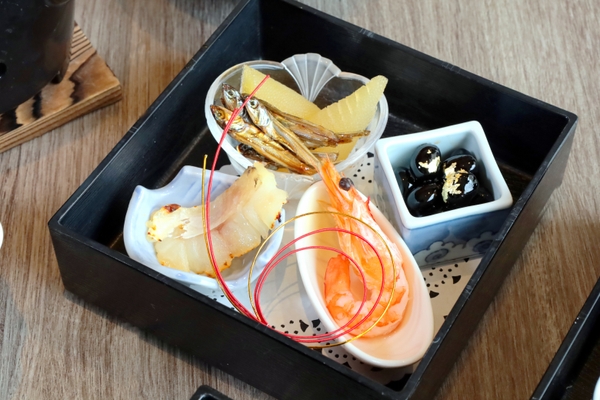 一段:数の子 田作り 黒豆 甘鯛の味噌漬け 海老芝煮