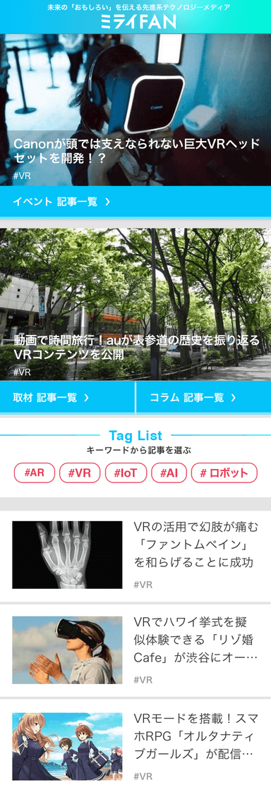 「ミライFAN」は、近年注目が高まる「VR(仮想現実)」「AR(拡張現実)」「IoT(モノのインターネット)」「ロボット」などのテクノロジーをテーマとした記事を中心に、ITの最新情報を幅広くお届けします。