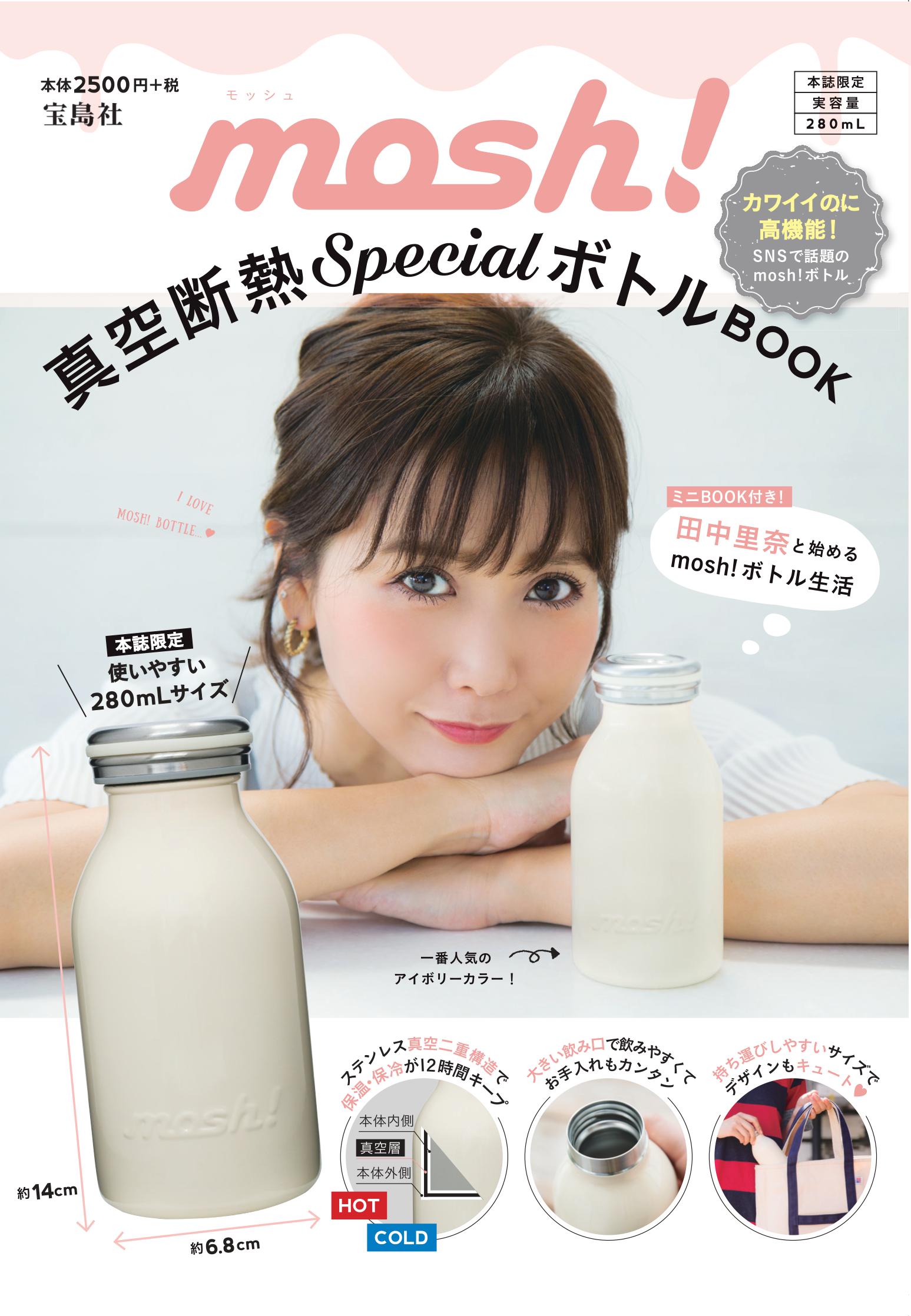今回発売する『mosh!真空断熱SpecialボトルBook』には、「mosh!」で一番人気のアイボリーカラーを採用し、女性でも片手で持てる大きさにこだわり、本誌限定の280mlサイズを付属しています。オフィスはもちろん、ピクニックやお散歩など日常のあらゆるシーンで活用することができます。誌面には、モデルの田中里奈さんが生活シーンごとに、オシャレで可愛い使い方を提案しています。