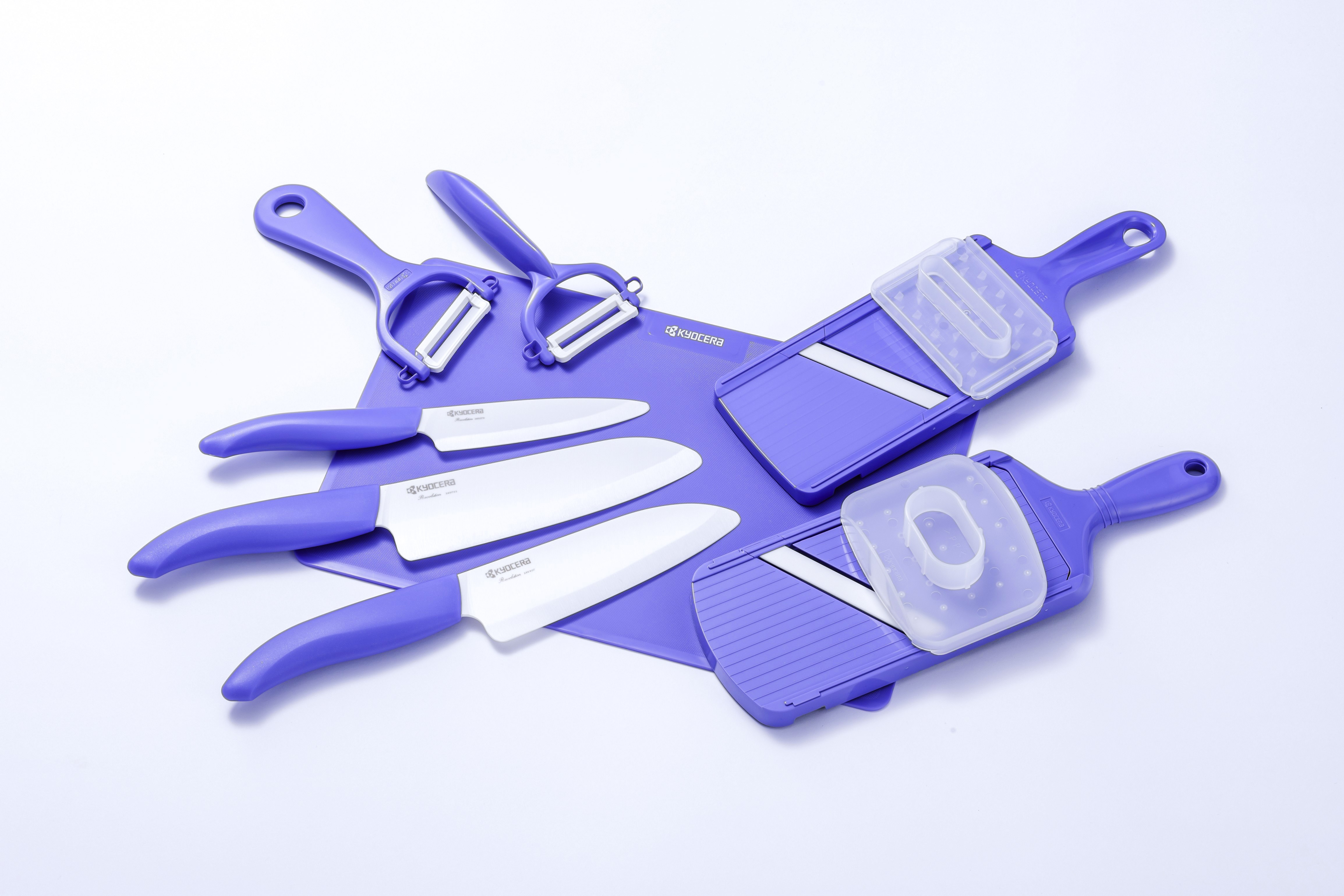 このたびの商品は、カラフルキッチンシリーズ発売10周年記念商品の第2弾であり、1年間の期間限定販売となります。ナイフ、ピーラー、スライサー、まな板など全8商品のカラーリングを、これまでにないシックで光沢感のある紫色に仕上げました。