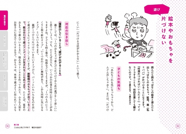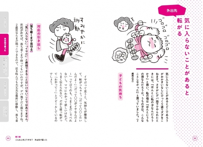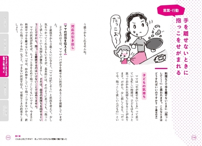 「こんなふうにグズるときはどう接したらいい?」「こんなワガママを言うときはどう折り合いをつけたらいい?」といった具体的なシーンについて、それぞれ<子どもの気持ち>と<対応の引き出し>という順で、“怒らずに済む関わり方”を提案します。