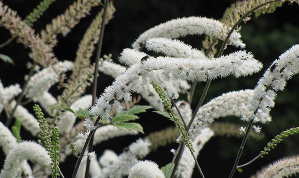 かつて、若葉を摘んでゆでた後、よく水にさらして食用にしていたことから、“晒し菜”の名前があります。同種のものは漢方で“升麻”と呼ばれ、その根茎は鎮痛剤として用いられてきました。当園に咲くサラシナショウマは、現在、見頃を迎えており、9月下旬頃までお楽しみいただけます。