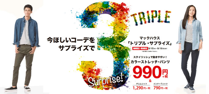 2016年9月14日 18:00この度、株式会社マックハウス(本社:東京都杉並区/代表取締役社長:白土 孝)は、「トリプルサプライズ」と題し、今ほしいコーディネートを、期間限定のサプライズ価格にて販売いたします。