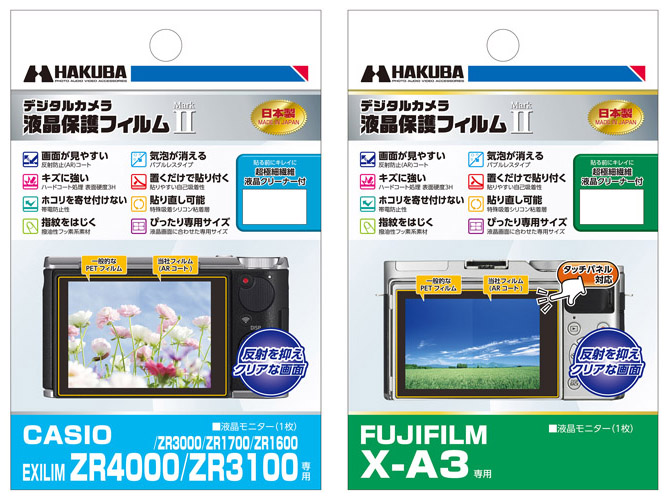 2016年9月15日 15:00ハクバ写真産業株式会社 (本社:東京都墨田区)は、バブルレスタイプのデジタルカメラ用液晶保護フィルムに、新発売の「CASIO EXILIM ZR4000」用と「FUJIFILM X-A3」用の2製品を追加いたします。