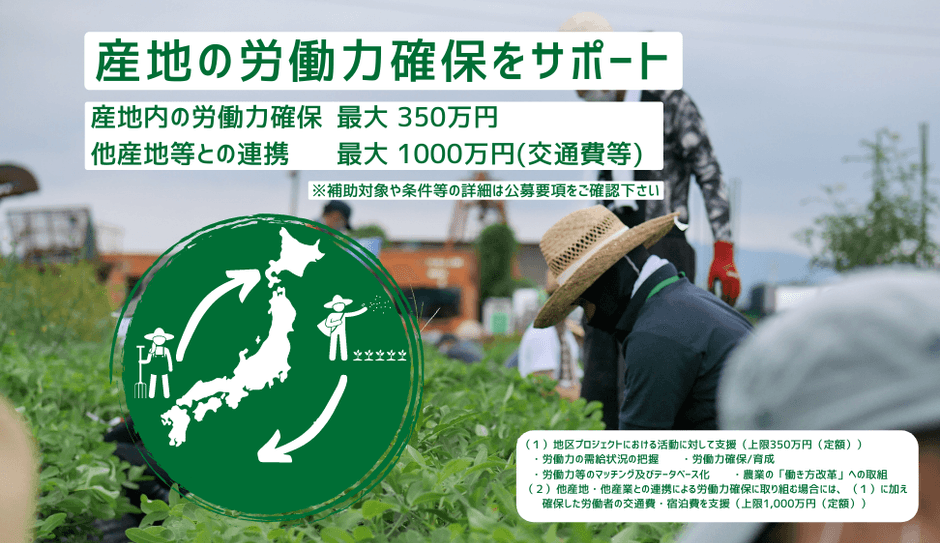 農業現場における労働力不足を解消するため、 産地内や、産地間連携での労働力確保の取り組みを支援します!