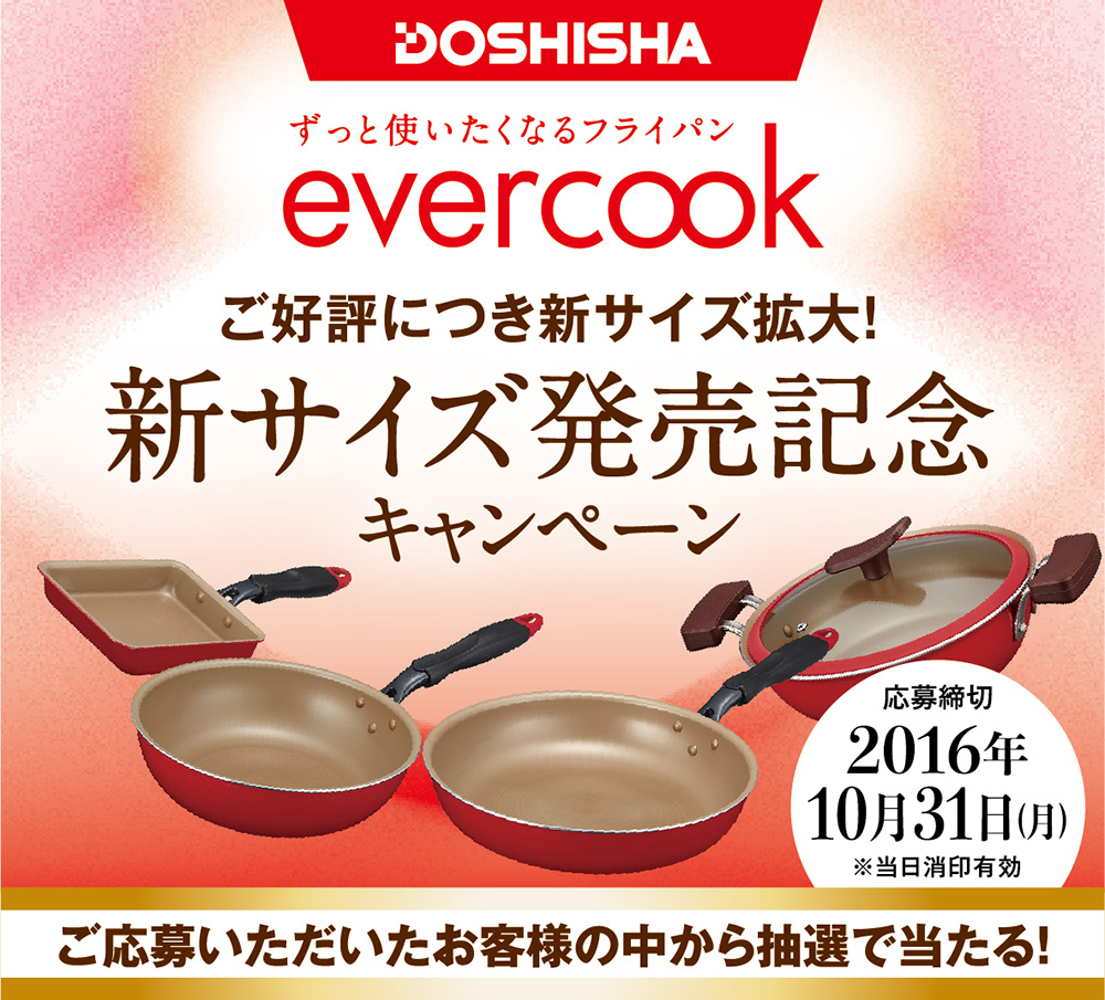 2016年9月21日 16:15 株式会社ドウシシャ(大阪本社:大阪市中央区、代表取締役社長:野村 正幸)は、「evercook フライパン」の新サイズ発売を記念し、2016年9月24日(土)から10月31日(月)まで、『evercook新サイズ発売記念キャンペーン』を実施致します。
