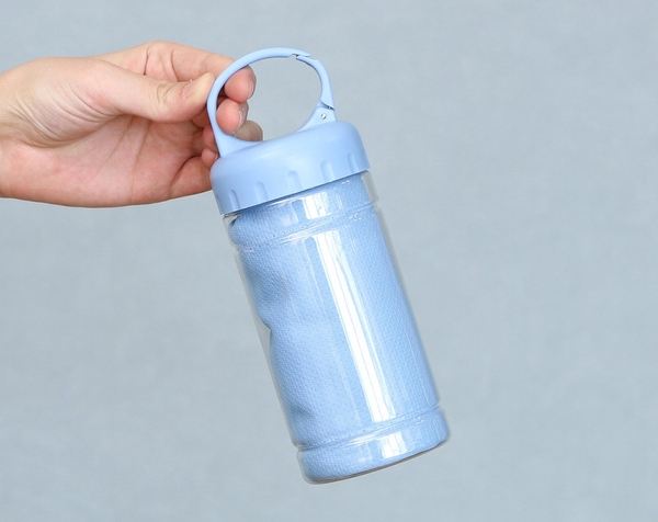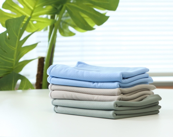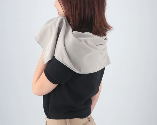 使い方はタオルを水に濡らし、水がしたたり落ちない程度に絞り、張るようにパシッと振るだけ。水の蒸発による気化熱の吸収と特殊素材の効果で冷たさを感じさせます。