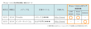 ※1:「WEBメディアの掲載調査」を行っているクリッピングサービス国内大手6社およびプレスリリース配信サービス国内大手6社のサービス内容を調査。本機能と同様の、WEB記事がどのキュレーションメディアに取り上げられたかを特定し報告できる機能がないことを確認。(2016年8月30日時点)