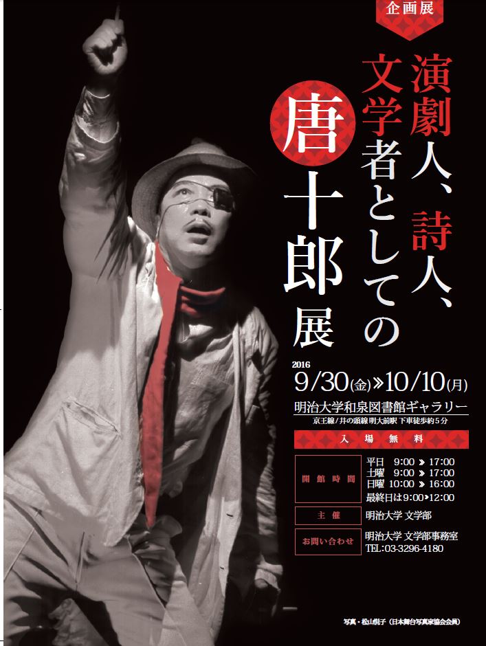 2016年9月23日 10:00 明治大学文学部は、企画展「演劇人、詩人、文学者としての唐十郎展」を開催します。9月30日から10月10日まで、入場無料。