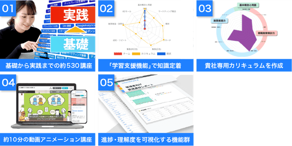 デジタルマーケティングを基礎から学ぶための約530の動画講座を配信し、導入企業やチームの目的に合わせたカリキュラムを提案することで、より効率的に学習することが可能です。利用者は動画視聴に加え、学習した情報・ノウハウのインプットや、理解度を確認するテスト機能や学習進捗に合わせてレベル表示がされるアウトプットを促進する機能を利用することができ、デジタルマーケティングに関する知識の定着を図ります。また、利用者の学習進捗や理解度を簡単に追える管理機能も提供しています。