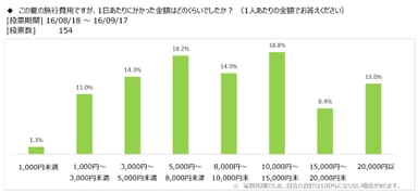 最後に1日の旅行費用を1人あたりの金額で答えてもらいました。その結果、1番多かったのは「10,000円~15,000円未満」という回答で18.8%になりました。2番目は「5,000円~8,000円未満」(18.2%)でした。