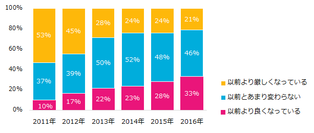 「最近の求人状況をどのように感じていますか?」と伺ったところ、「以前より良くなっている」と33%の方が回答しました。2011年10%→2012年17%→2013年22%→2014年23%→2015年28%→2016年33%と、6年連続で右肩上がりに推移しています。