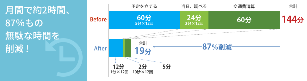 ヴァル研究所が週に3回以上の外出をしているビジネスマンを対象に行った実態調査によると、都市部のビジネスマンは営業や打ち合わせなどで外出する際、「アポイントメント時」「移動前(出発時)」「移動中」「交通費精算時」の場面で経路検索を何度も行っていることがわかりました。さらに、面倒・憂鬱な作業と感じている方が多くいることや、これらの作業にかかる時間が月間で144分以上になるという試算結果を得ることができました。