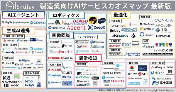 製造業向けAIサービスカオスマップ2025は、課題解決の手がかりや最適化技術による生産プロセスの効率化、AIエージェントを活用した業務支援として急速に進化するAIソリューションを6カテゴリーでわかりやすく分類化したカオスマップです。