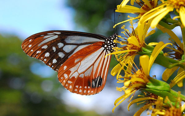 アサギマダラは、前翅長40~60mmの可憐なチョウです。アサギマダラの「アサギ(浅葱)」は青緑色の古い呼び名で、翅の薄水色に由来しています。幼虫は「キジョラン」など、ガガイモ類の葉を食べます。また、雄の後翅には、雌にはない黒褐色の性標があり、それにより雄雌の区別ができます。「ヒヨドリバナ」や「フジバカマ」「オタカラコウ」など、キク科の植物で吸蜜することが多く、例年では10月下旬頃までみることができます。
