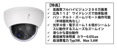遠隔地の端末からのパン・チルト・ズーム操作により360°全方位と光学4倍・電子ズーム16倍の撮影ができます。また、レンズ広角側が112°とワイド撮影ができるため、監視カメラの台数の削減が可能となります。消費電力3Wと低消費電力特性で、商用電源不要の自立電源運用を実現しています。