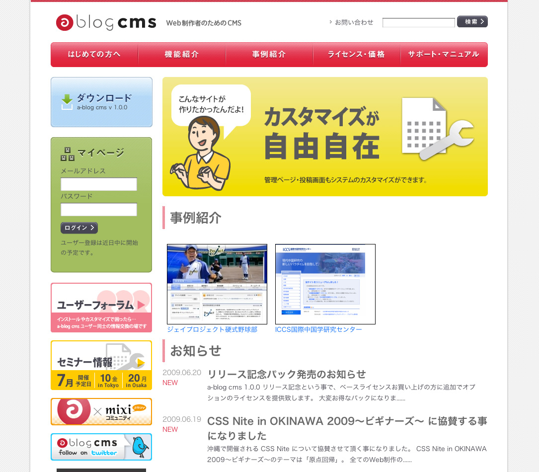 「a-blog cms( http://www.a-blogcms.jp/ )」は、その名前の通り「a-blog」を前身としたCMS(Content Management System)です。「a-blog」の大きな特徴のひとつだった「利用者のコンテンツの更新のしやすさ」を受け継ぎつつ「Web制作者がサイトを作る際の作りやすさ」も考えられたシステムになります。
