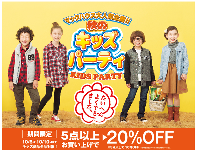 秋の衣替えに マックハウスの「KIDS PARTY」開催成長の早いお子様は季節ごとにサイズが変わり、買い替えに何かと出費がかさみます。マックハウスでは、2016年10月6日(木)~10月10日(月)の5日間、衣替え特別企画としてキッズ商品まとめ買いのご提案をいたします。期間中、キッズ商品3点以上お買上げで10%OFF、5点以上お買上げで20%OFFと、沢山買うほどよりお買い得な大好評キャンペーンです。