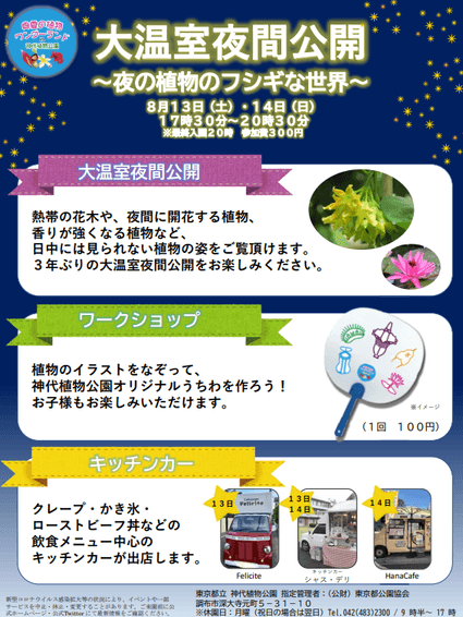 ※「大温室夜間公開」は「真夏の植物ワンダーランド in 神代植物公園」のイベントの一部として開催しております。