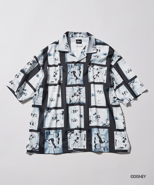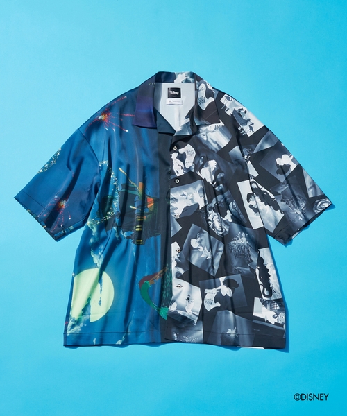 ディズニーとピクサー作品のシーンをコラージュし総柄プリントしたシャツ。