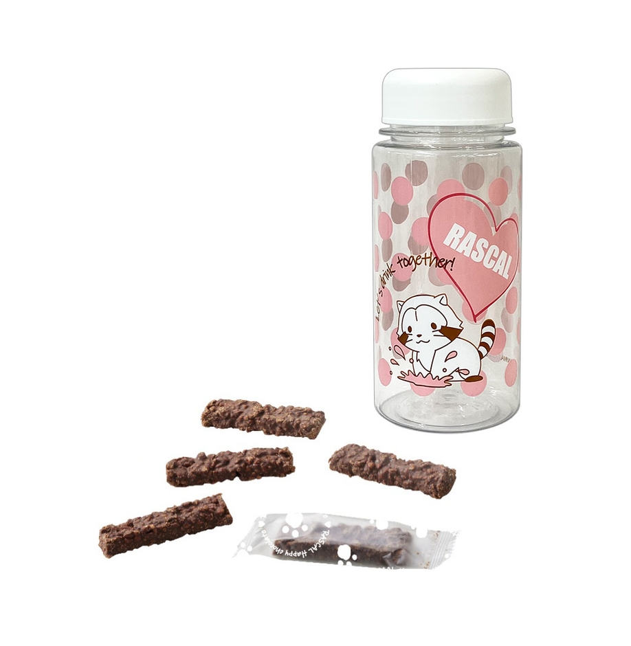 ミルクチョコレートクランチ5個入り。持ち運びに便利な容量350mlのボトル。お茶目でキュートなラスカルのデザイン入りです。