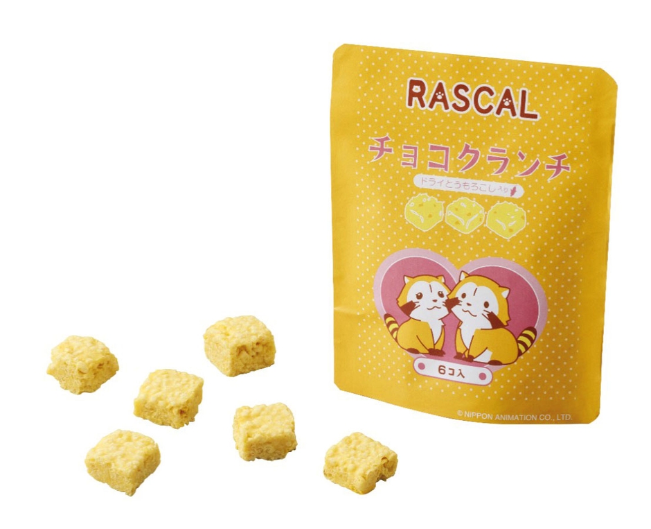 ラスカルの大好物のとうもろこしを練りこんだクランチチョコ6個入り。パッケージはラスカルとリリィの可愛らしいイラスト。