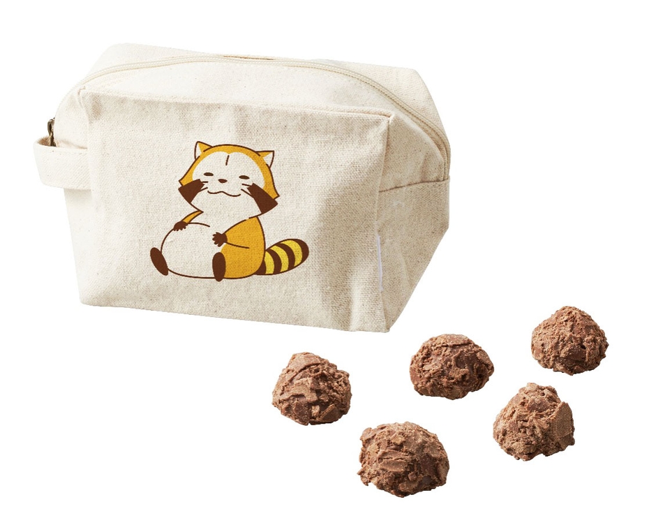 ラスカルがプリントされたキャンバス生地の小型ポーチは普段使いにもぴったりなサイズ。ベルギー産の口どけなめらかなトリュフ付き。