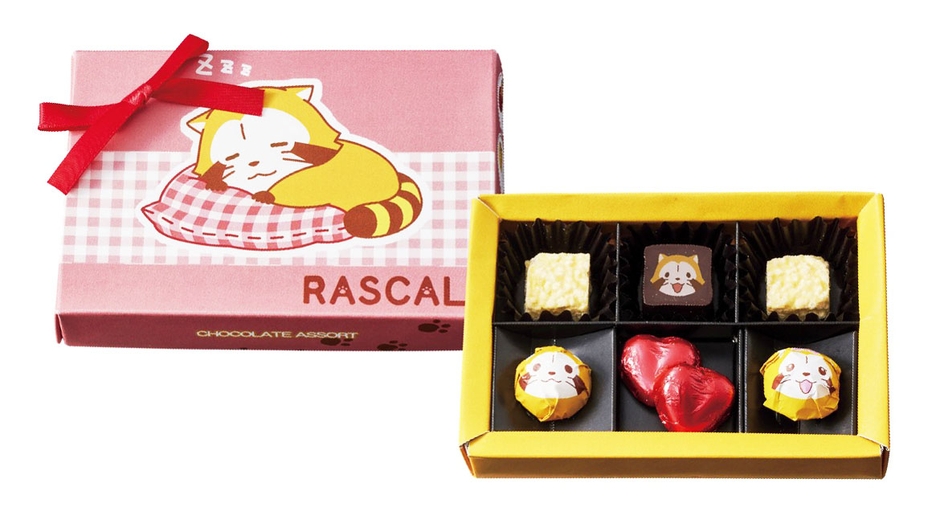 ラスカルとリリィが登場する見た目もかわいいチョコアソート。アイキャッチとなるハートのチョコや、フリーズドライとうもろこしが入ったクランチチョコ入り。パッケージはラスカルがおやすみ中のイラスト。
