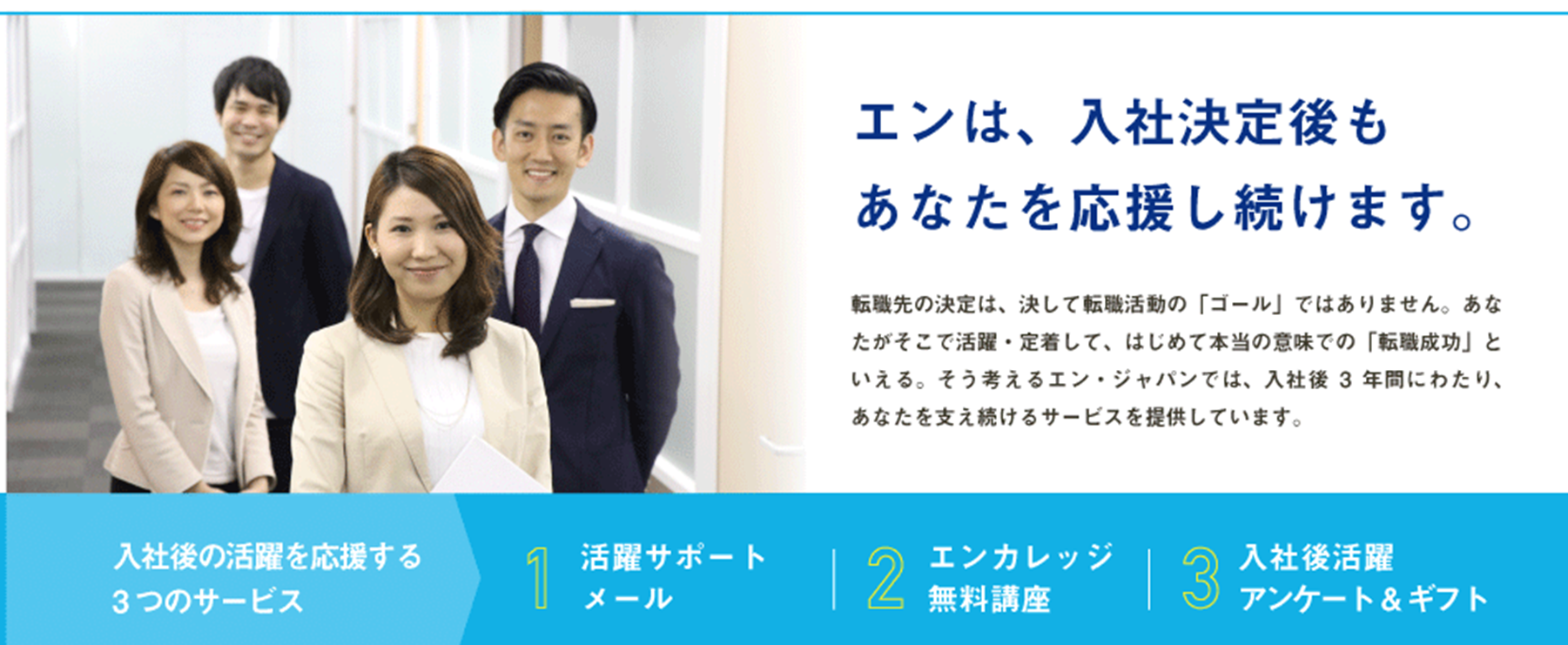 エン・ジャパンは、”入社” がゴールではなく、入社後の会社に馴染んで活躍している姿を転職成功と考えています。転職支援サービスでは、求人企業と求職者のミスマッチを防ぐため「求人サイト初の職場風景動画」「完全取材の第三者視点でつづる仕事のやりがい・厳しさ」「社員・元社員のクチコミ」といった定性情報で良いところも、悪いところも正直に伝えてきました。本プログラムでは、入社した方を3年間にわたって支え続けます。