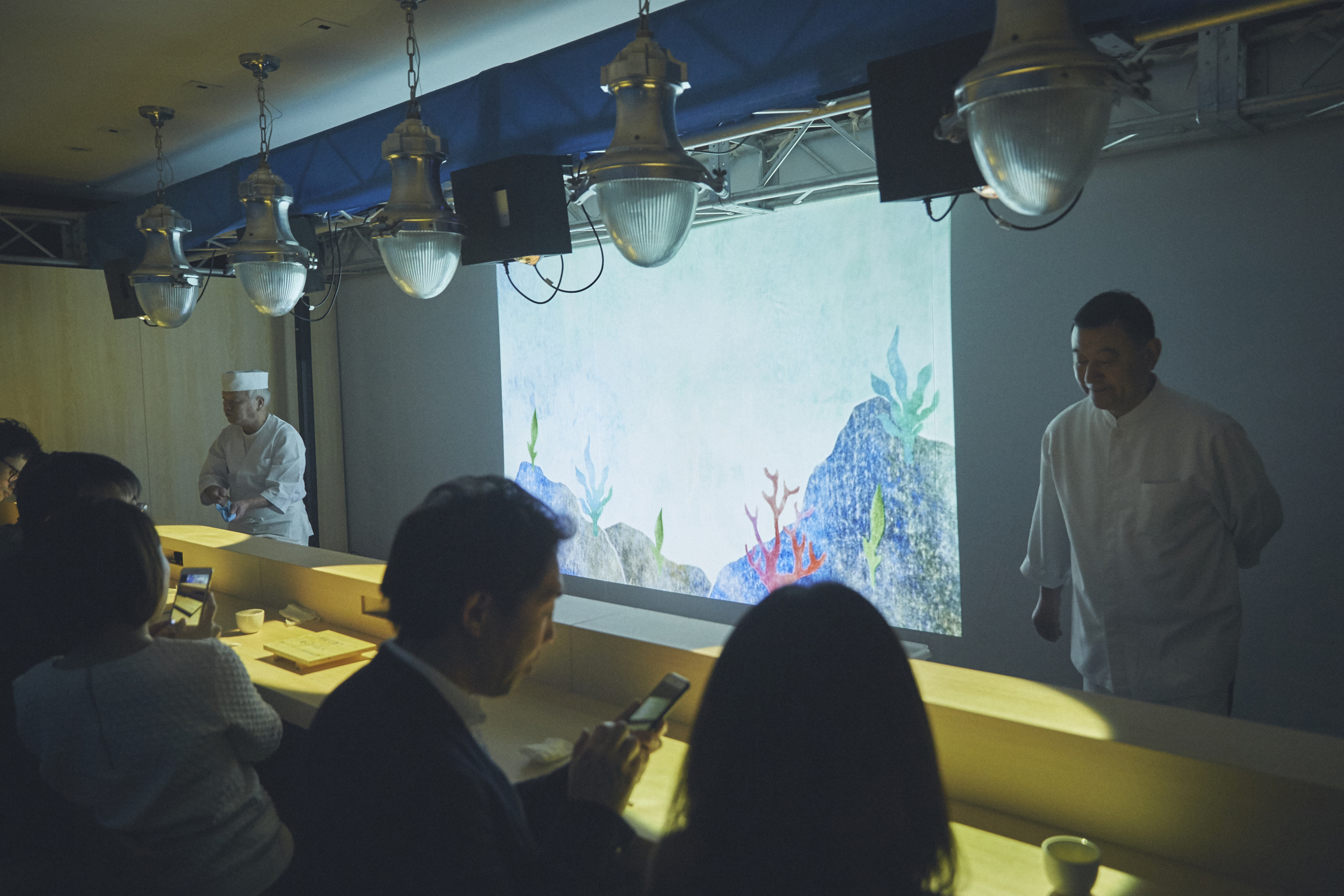 プロジェクションマッピングの技術を応用し、実際に職人が握るお寿司を食べながら、寿司のネタとなる魚について、大人も子供も楽しく学ぶことができます。