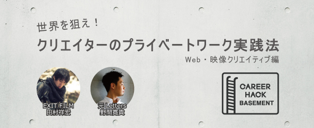 プライベートワークで海外のアワードを受賞した EXIT FILMの田村祥宏氏と元Letters代表の野間寛貴氏が登壇。お二人が取り組んできたプライベートワークの実績や企画立案、ポートフォリオの作り方、キャリアへの影響を語っていただきます。本イベントを通じて、クリエイターがプライベートワークへ取り組む価値を共に考える機会をつくり、活躍の場を広げてもらいたいと考えています。