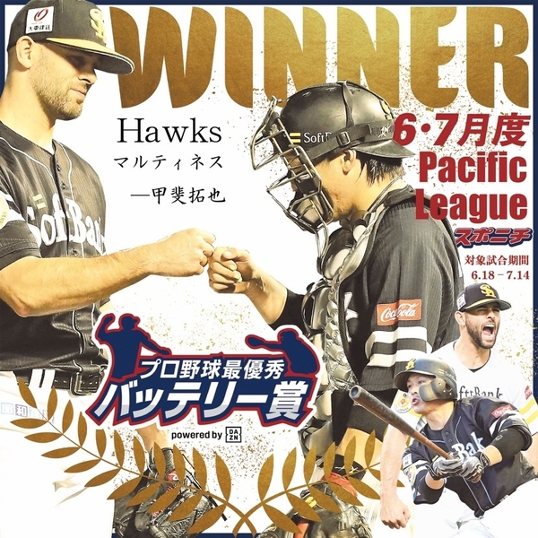 株式会社スポーツニッポン新聞社(本社:東京都江東区、代表取締役社長:小菅洋人、以下スポニチ)とスポーツ動画配信サービスのDAZN(ダゾーン)は9日、「2021プロ野球最優秀バッテリー賞 powered by DAZN」の7月度月間賞(対象期間は6月18日~7月14日)を下記の通り発表しました。DAZNの公式Twitter(@DAZN_JPN)でのファン投票の結果、セ・リーグからは阪神・青柳晃洋投手(27)と梅野隆太郎捕手(30)、パ・リーグからはソフトバンク・マルティネス投手(31)と甲斐拓也捕手(28)のバッテリーが選出されました。