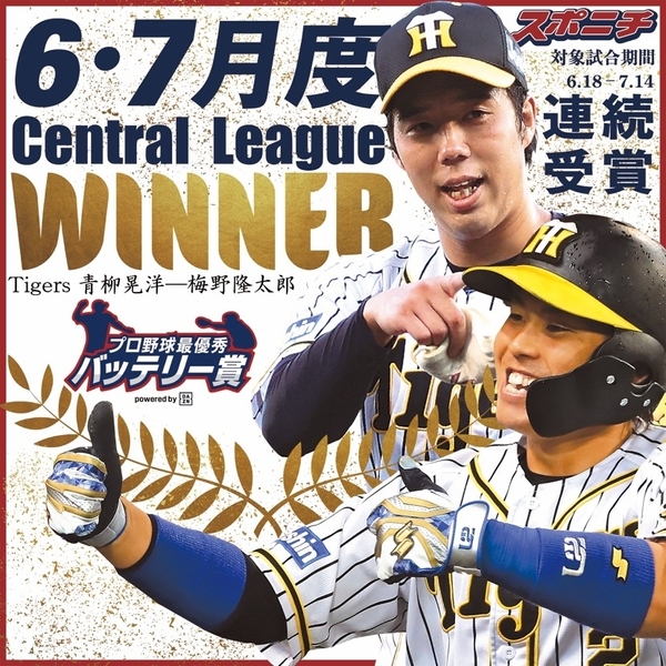 前月の6月度に続き、侍ジャパンバッテリーが連続受賞。青柳は期間中4試合29回を投げて18奪三振、防御率0.93で3勝と圧巻のピッチングを披露した。梅野は打率.300で6打点と打撃でチームの首位堅守を支えた。