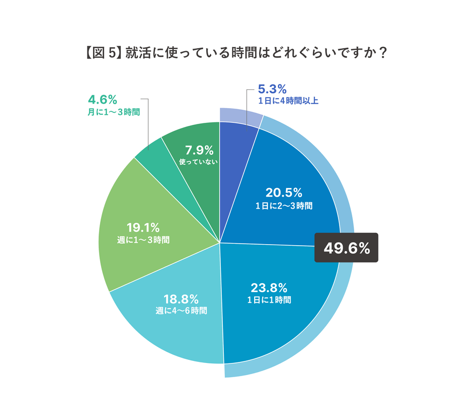 「就活に使っている時間」(必須回答)は毎日何らかの時間を設けている就活生が49.6%にのぼり、「1日に4時間以上」が5.3%・「1日に2~3自時間」が20.5%でした。10月時点でかなり熱心に対策をおこっている就活生も一定数いるようです。