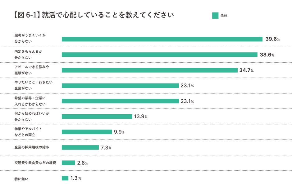 就活対策を熱心におこなっている背景には就活への不安も一因として考えられそうです。「就活で心配していること」(必須・複数選択〈2つまで〉)では、「選考がうまくいくかわからない」(39.6%)、「内定をもらえるか分からない」(38.6%)が上位を占め、「アピールできる強みや経験がない」(34.7%)が続きました。