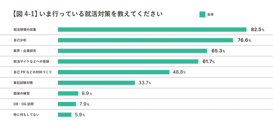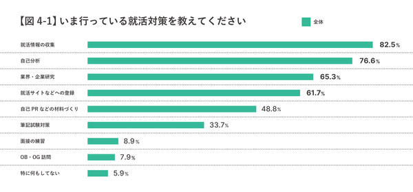 「いま行っている就活対策」(必須・複数回答)をたずねたところ、「特に何もしていない」は5.9%で、94.1%がすでに何らかの対策をはじめていました。そのなかでもっとも多いのが「就活情報の収集」(82.5%)となり、「自己分析」(76.6%)、「業界・企業研究」(65.3%)、「就活サイトなどへの登録」(61.7%)が続き、就活生にとって企業選びや選考を有利に進めるための準備をおこなっている段階といえそうです。