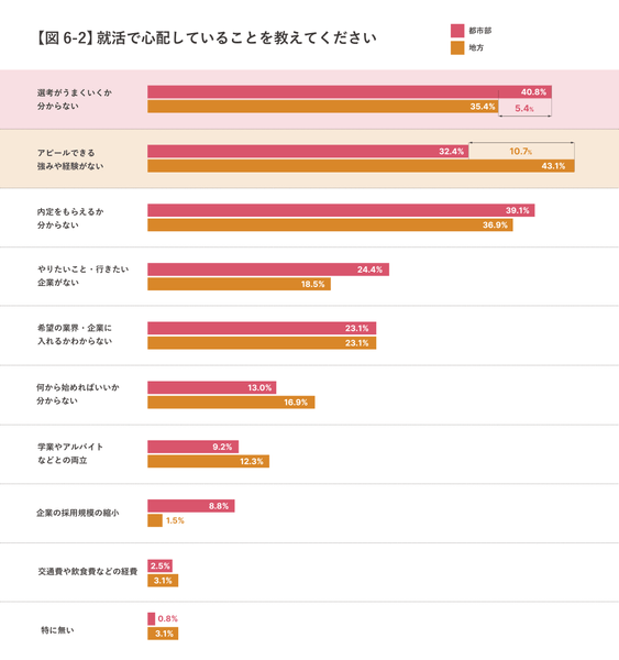 不安と感じている点は、都市部と地方部の就活生で違いが見られました。都市部は「選考がうまくいくか分からない」(40・8%)が最も多かった一方、地方部は「アピールできる強みや経験がない」(43.1%)の回答が多くありました。