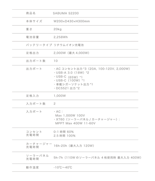 S2200は、電気自動車(EV)でも採用されるBMS(バッテリーマネジメントシステム)、Smart Ventilation System(自律制御放熱システム)などの高度なバッテリー安全性制御技術を開発・採用することで、クラス最小レベルのコンパクトな筐体ながら、2,258Wh / 2,000Wという大容量・大出力のポータブル電源を実現しています。 2,258Wh / 定格出力2, 000WのSABUMA S2200は、例えば50インチテレビを18時間、小型冷蔵庫を50時間以上、電子レンジを連続2時間以上使用できるほどのハイスペックである為、キャンプや車中泊などのレジャー用途だけでなく、災害等による停電時のバックアップ電源としてや、屋外作業を伴うさまざまな業務用途としても十二分に長時間お使いいただくことが出来ます。 それだけのハイスペックでありながら、人に優しい流麗でシンプルなデザインは、さまざまな人々の暮らし、シーンにさりげなく溶け込みます。