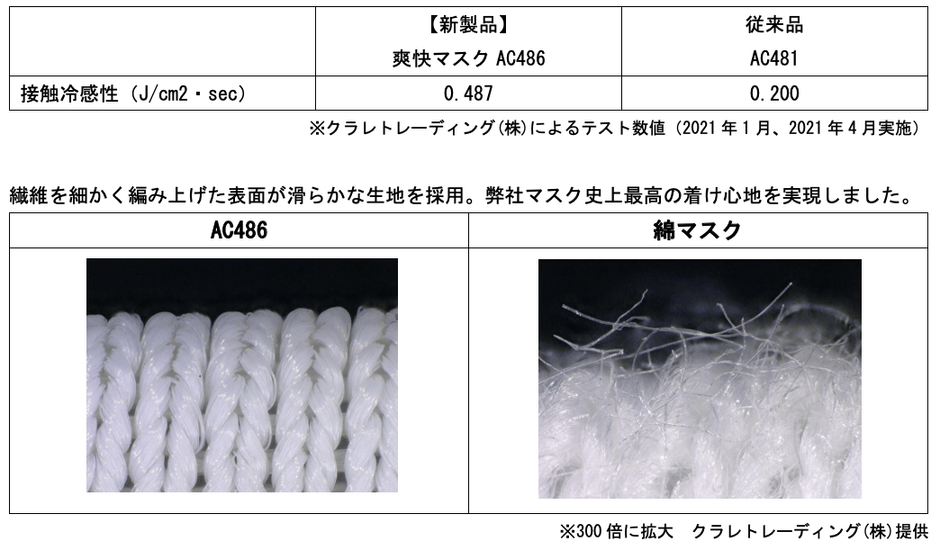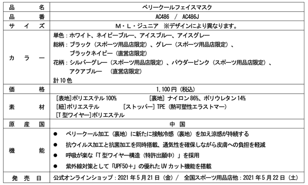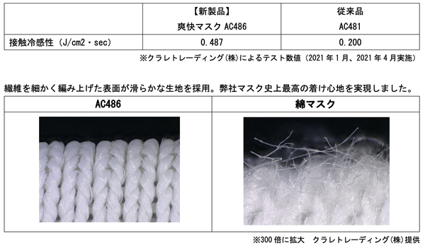 この度、新たに接触冷感性の高い素材を採用し、ダブル・クーリング機能で弊社史上No.1※1の圧倒的な涼感を実現した最新版のフェイスマスク「爽快マスク(AC486)」を2021年5月21日(金)より発売いたします。販売枚数は300,000枚を計画しております。